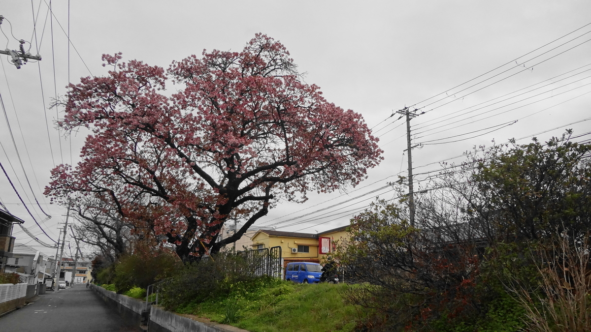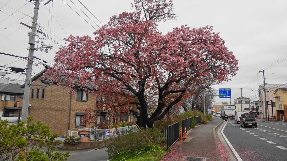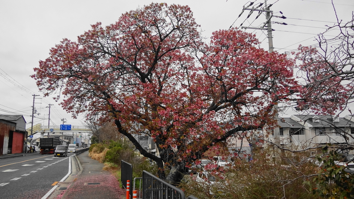 和歌山市中之島の国道24号線沿いの遊歩道に咲く寒緋桜。