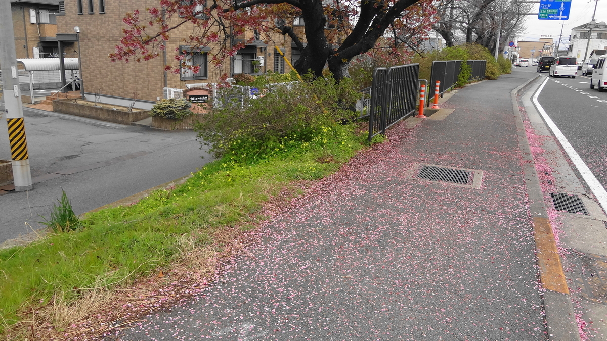 昨日降った恵みの雨で、薄いピンク色の花びらが歩道に少し散っていた。